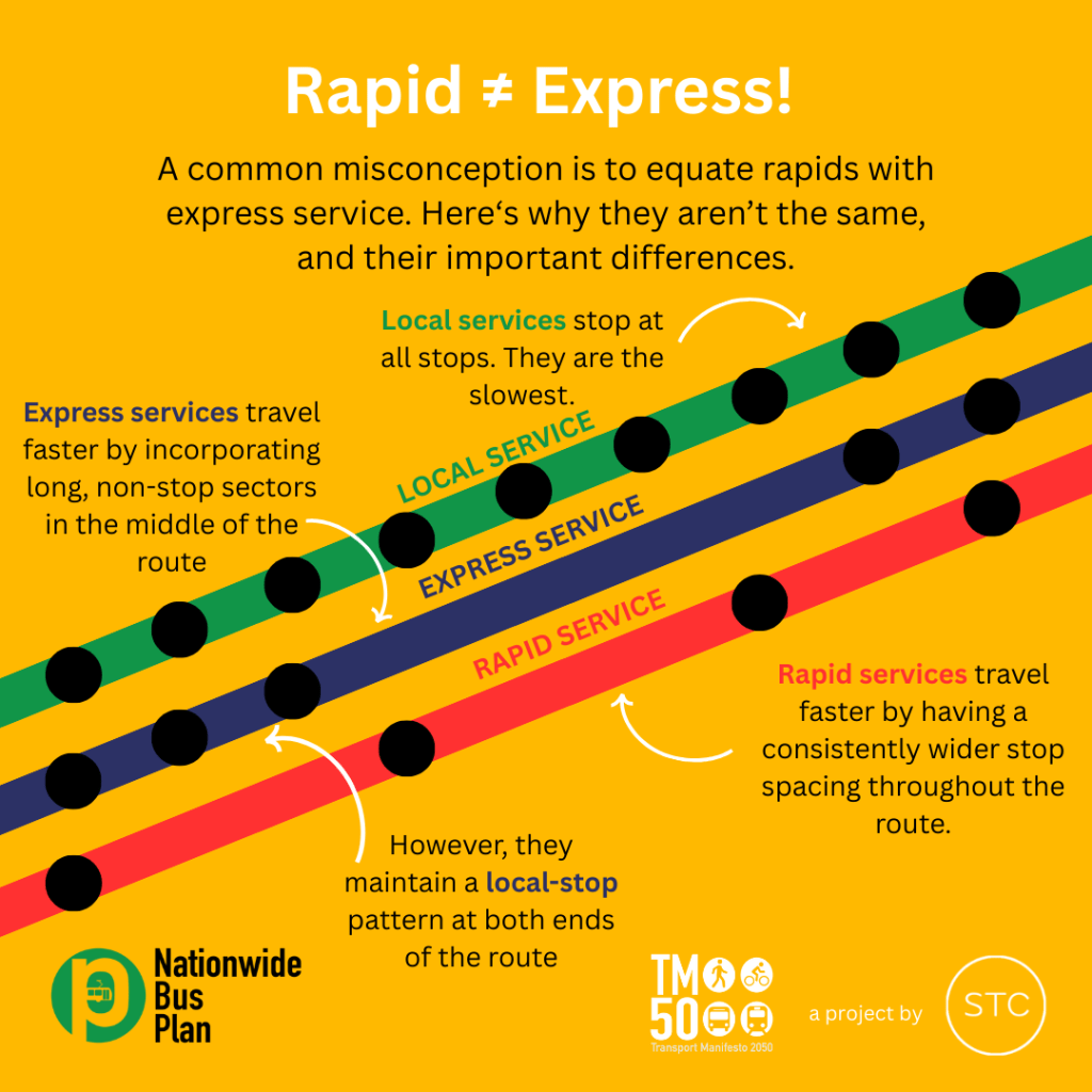 It’s worth hammering the point home again: Express routes are faster due to their long nonstop segment. Rapid routes are faster due to longer stop spacing. If it’s still unclear: the MRT is faster than the local bus in Singapore because relative to the bus service, the MRT is a rapid-stopping network (with exclusive rights-of-way) that has a much wider stop spacing than the bus. There’s no reason why buses can’t do something similar, while reasonably avoiding direct duplication of course.