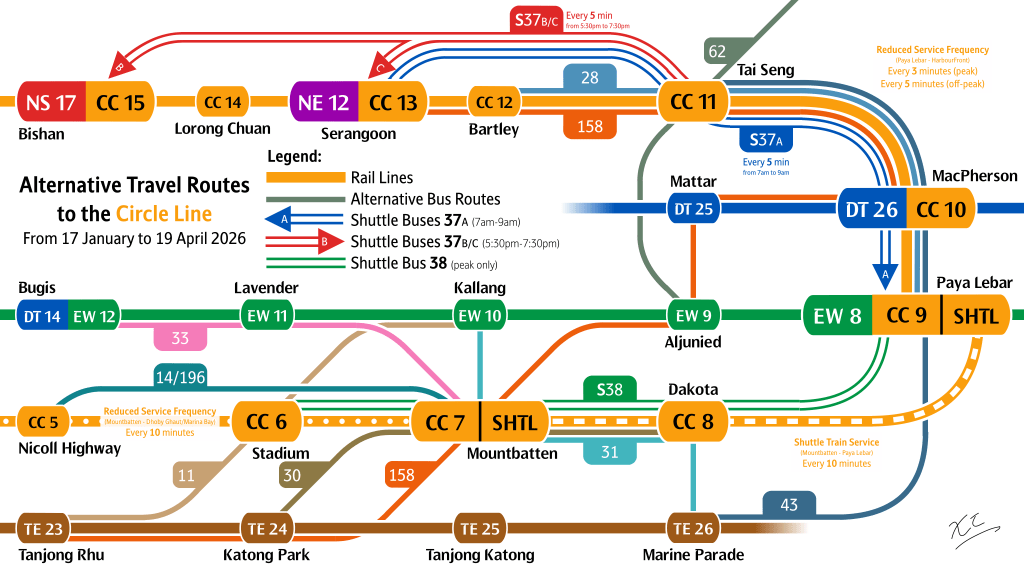 This year, to complement the 33% reduction in CCL capacity (from 27930 to 18620 passengers per direction per hour from Paya Lebar to HarbourFront), LTA has introduced shuttle bus services to complement travel patterns that see higher demand during peak hours. All 3 services (37A, 37B, 37C) in the Shuttle 37 series serve Tai Seng, a major employment hub. This is in tandem with Shuttle 38, serving the most affected stretch in Paya Lebar to Stadium.