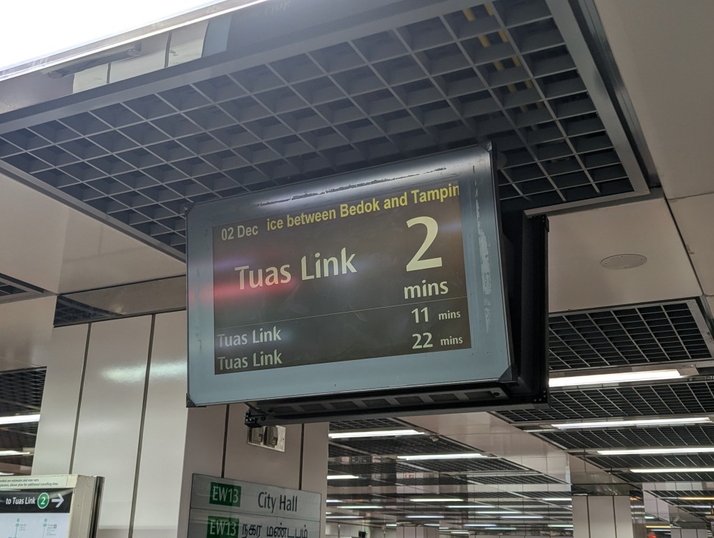 In response, acting transport minister Jeffrey Siow stated there was no need for such information provisions as trains operate frequently , reducing the need for real-time tracking to plan journeys. It’s not entirely a correct statement for two reasons, the first of which has been explored above in informing commuter choices between multiple possible routes on the increasingly grid-like rail network. The second, which he likely may be unaware of, is that certain sections of the rail network do not operate at “short” intervals as claimed. Missing a train at Tuas Link for instance, means a waiting time of as long as up to 18 minutes for the next departure depending on time of day and week. If you were travelling there by bus 182, you’re much better off staying on the bus all the way to Joo Koon, where you might even catch up to an earlier train!