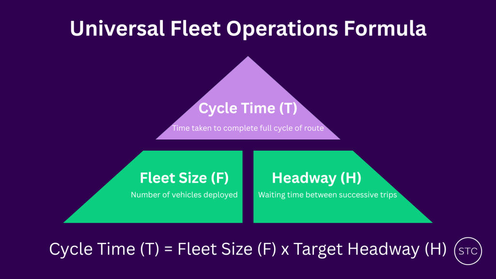 NB: This formula applies for all modes of regularly scheduled public transportation (rail, bus, ferry etc). This also affects airlines to a certain extent too! Hence, I’ll use “vehicles” as a catch-all term to refer to fleet assets operating on public transport routes when discussing the mathematical theory behind this fundamental fleet management formula. Feel free to replace it with your transport mode of choice, if it better helps you understand the concept.