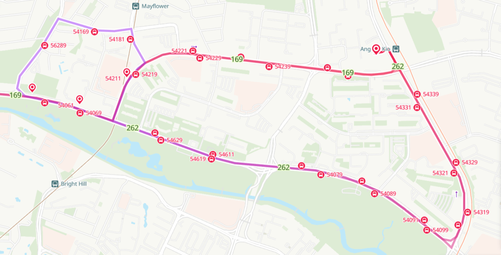 What does culling a non-essential feeder look like? Let’s look at a particularly glaring example from Ang Mo Kio. Feeder service 262 connects the bus interchange to Mayflower MRT…. but via a circuituous route through Ave 8 and Ave 1, instead of the more direct Ave 3 route. It runs at unimpressive headways (10-12 min) too, for what it’s worth.